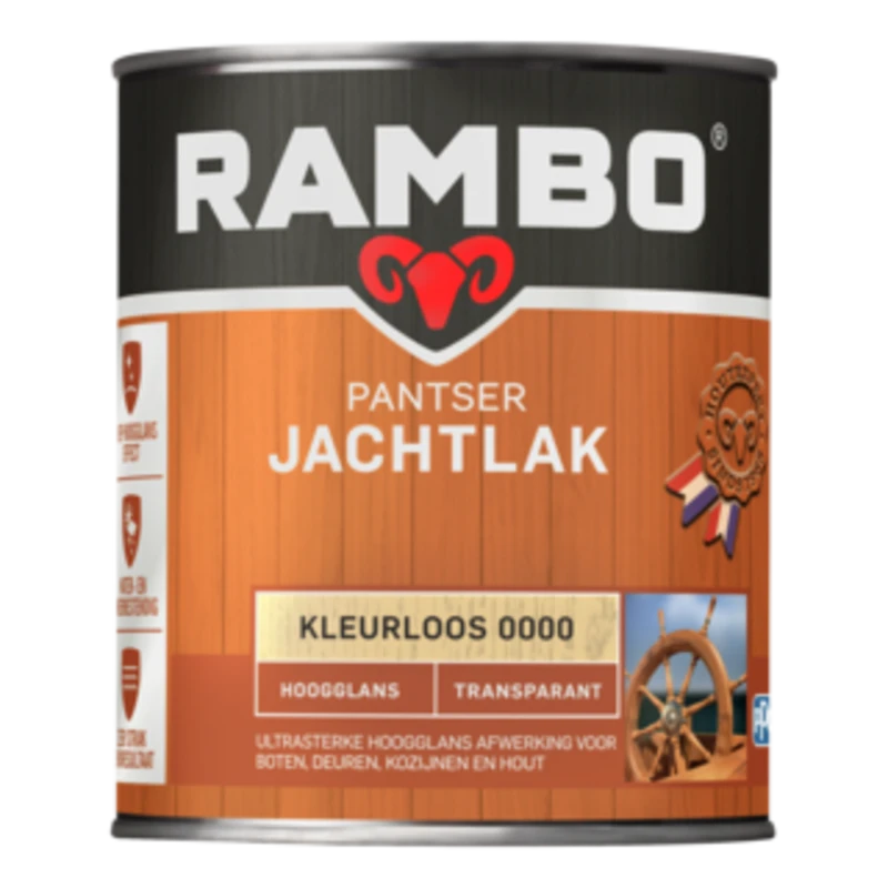 Rambo 'Jacht Lak Transparant' is een hoogglanslak op basis van houtoliefenol en biedt de sterkst mogelijke bescherming voor de houten opbouw (inclusief interieur) van boten. Gemakkelijk verwerkbaar, zoet- en zoutwaterbestendig. Extra duurzaam door UV-F technologie, UV-bestendig én flexibel. Voor het aflakken van houten, metalen of stalen (pleziervaart)jachten boven de waterlijn. Tevens geschikt voor het aflakken van kozijnen, deuren en betimmeringen.