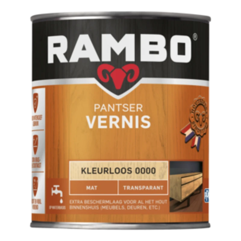 Een watergedragen blanke matte vernis op basis van acryl voor een extra fraai eindresultaat. Voor houtwerk - al dan niet - voorzien van eeneerdere laag. Rambo 'Pantservernis Transparant Acryl Mat' accentueert de houtnerftekening, is geurarm, droogt snel en is gemakkelijk verwerkbaar. Vocht- en vuilwerend. Geschikt voor houten deuren, kozijnen, betimmeringen en meubels binnen.